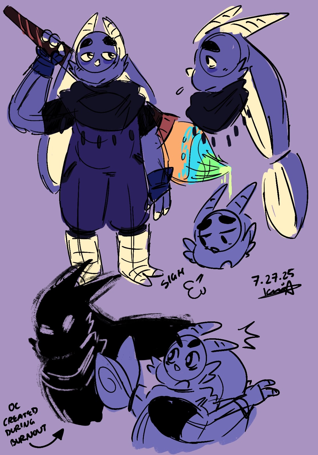 Also I just wanted to talk a bit about Umbra- I really did go out and make the most Exhausted Tired Burned Out Artist Ever. They have eyebags, they're perpeturally tired and haven't seen more than a few hours of sleep at a time in days, they have RSI and wear wrist support braces (those aren't fingerless gloves hahaaaa), pretty sure she has back pain in her late 20s.... but despite all of that, she'll learn and everything will get better in the end.
