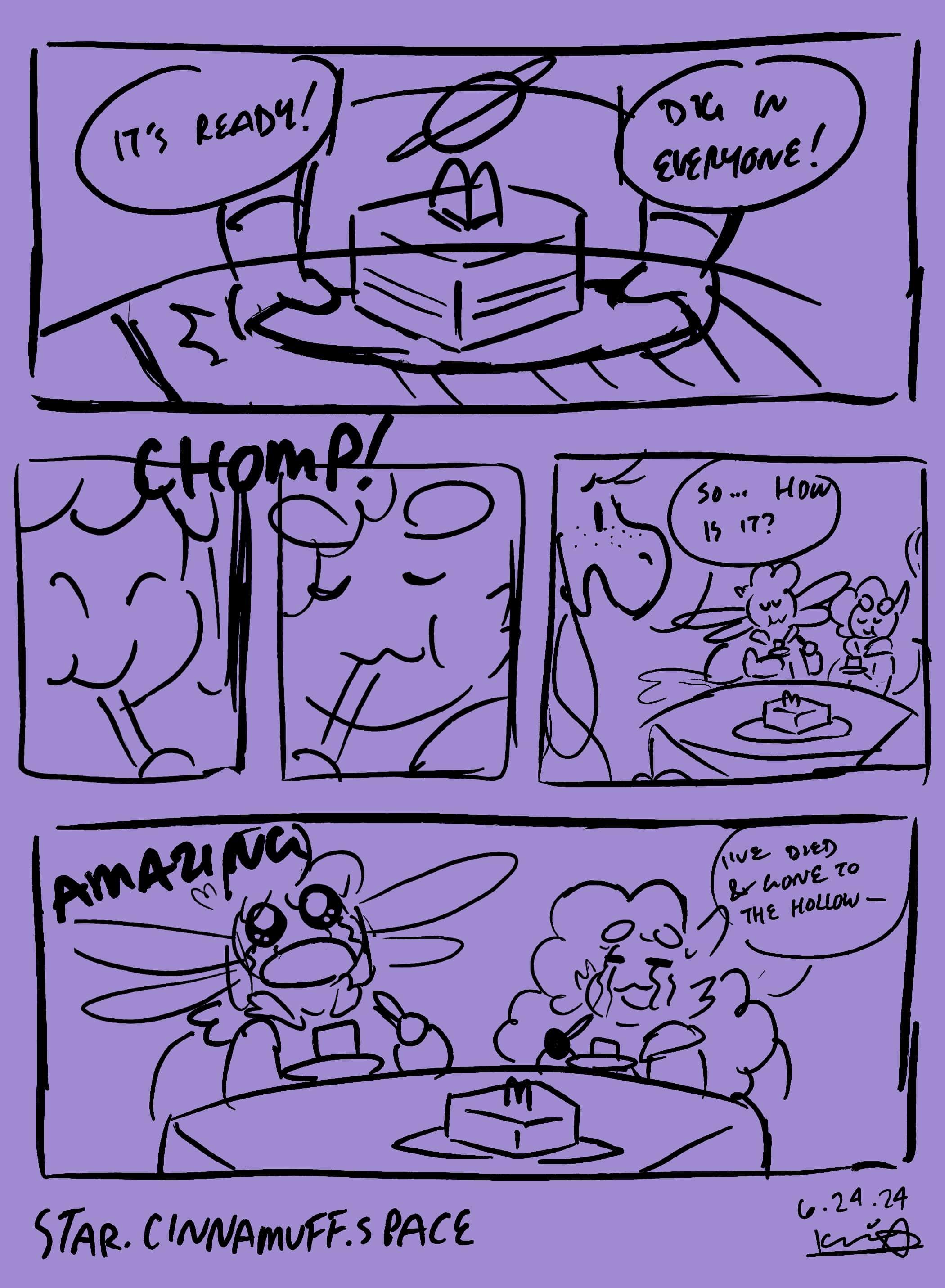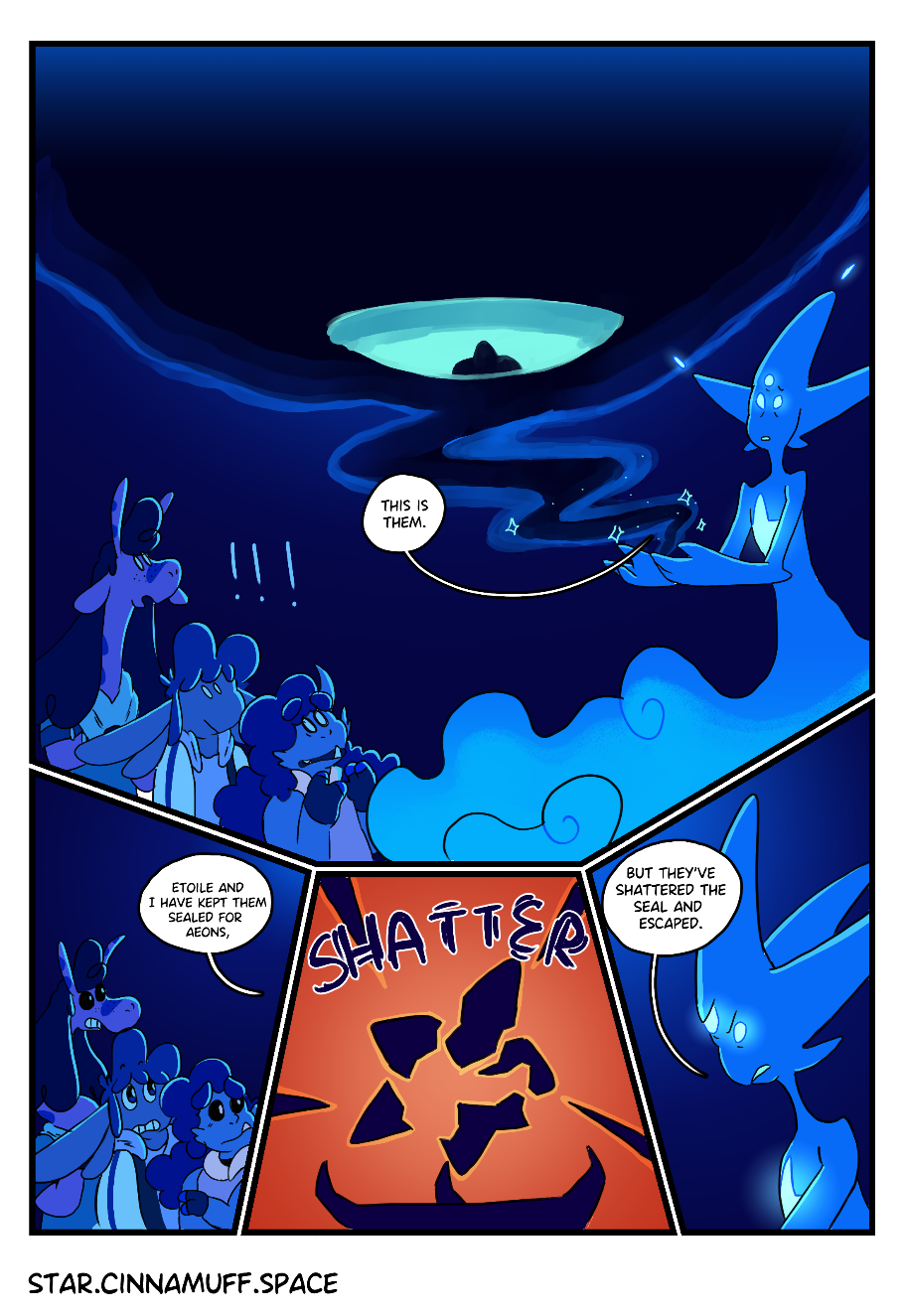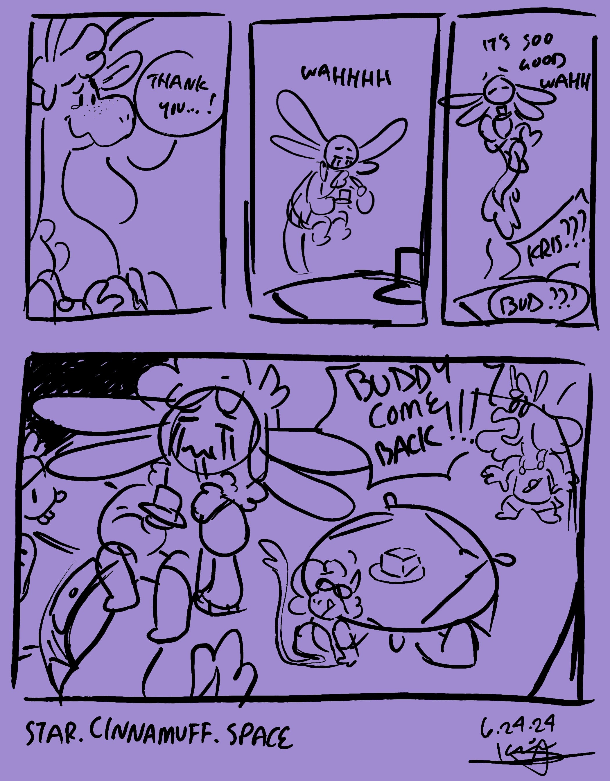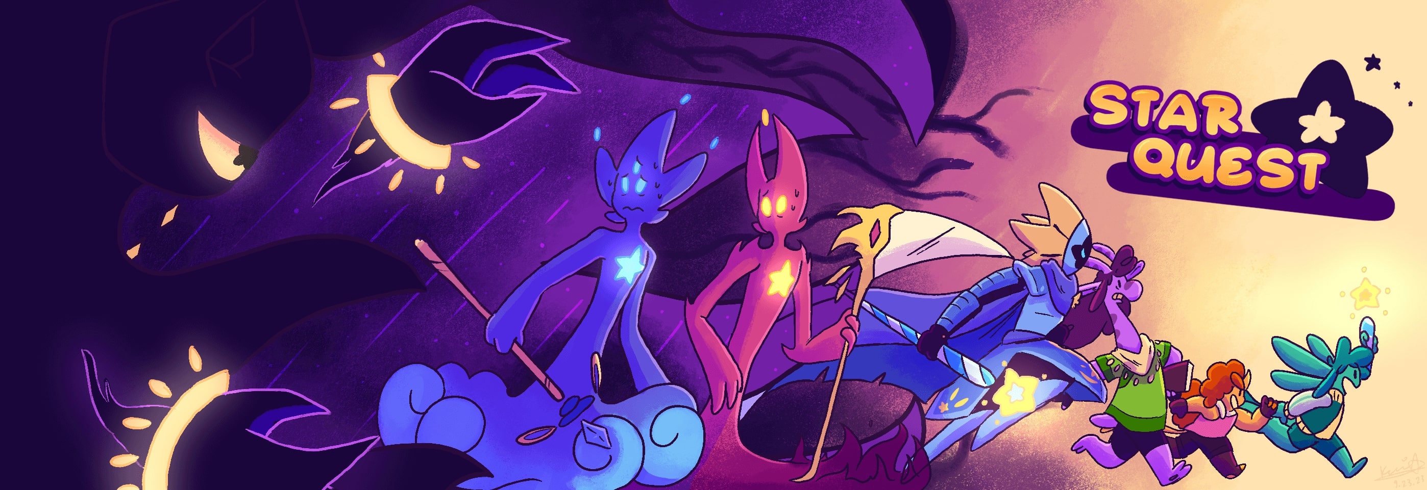 Star Quest is a comic about space traveling aliens saving their universe from a vengeful deity who wants to destroy it. It's heavily inspired by the Kirby series, the webcomic Cucumber Quest, with bits and pieces of DELTARUNE. It's a story that I've been developing since late 2011 and means a lot to me!